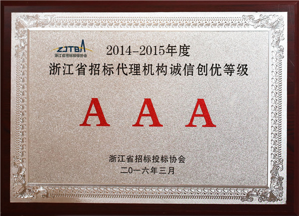2014-2015年度浙江省招标代理机构诚信创优等级AAA