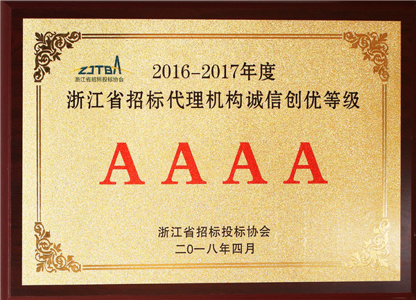 2016-2017年度浙江省招标代理机构诚信创优等级AAAA