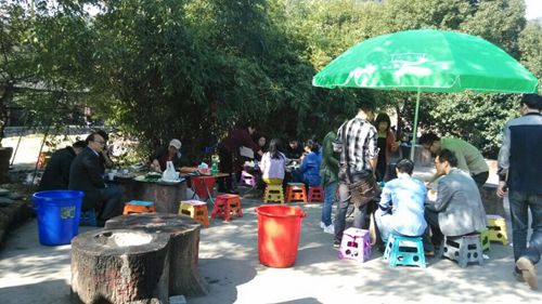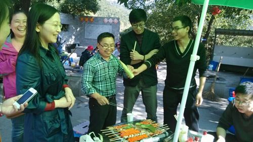 周六上午,在培训课结束后,公司组织全体员工赴九龙湖闻溪阁烧烤。
