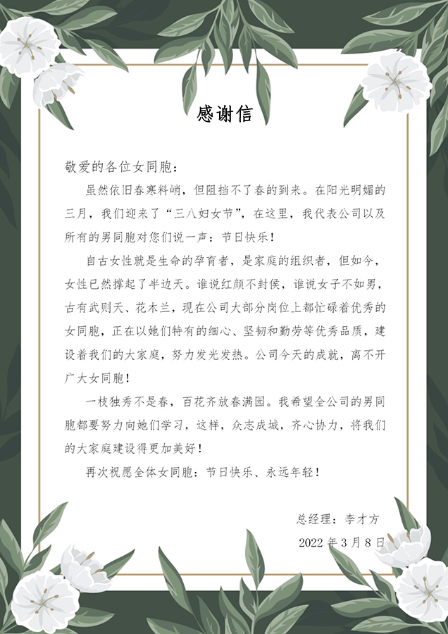 这天,公司总经理李才方先生向女职工们发出了慰问信,向她们致以节日的祝贺和美好的祝福。在过去的时光里,公司女性员工奋发进取,以女性特有的人格魅力、高尚的道德情操,尽心尽责,默默奉献。以“半边天”的工作责任情怀,以“巾帼不让须眉”的坚韧精神,在平凡的岗位上贡献着自己的全部力量。她们敢于挑大梁、担大任,对公司各方面发展起着不可小觑的地位,李才方先生为她们的精彩人生点赞!