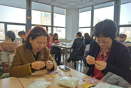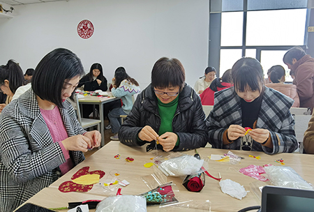 听了布艺老虎制作的方法和步骤介绍后,在老师的传授下,大家一针一线缝制作品,放入棉花、系挂绳、修整造型、缝合。现场的每个人都做得非常认真,从一开始的小心翼翼到熟能生巧,一边讨论、交流各自的手工心得,一边互相帮助。经过两个多小时的努力,一只只活灵活现的布艺老虎诞生了。在布艺DIY过程中,大家暂时远离了紧张的工作节奏,心绪趋于平和。在这种轻松愉悦的氛围下,每个人都变得心灵手巧,制作过程也变成了一种享受,不知不觉中突破了自我,体会到手工制作工艺之美。