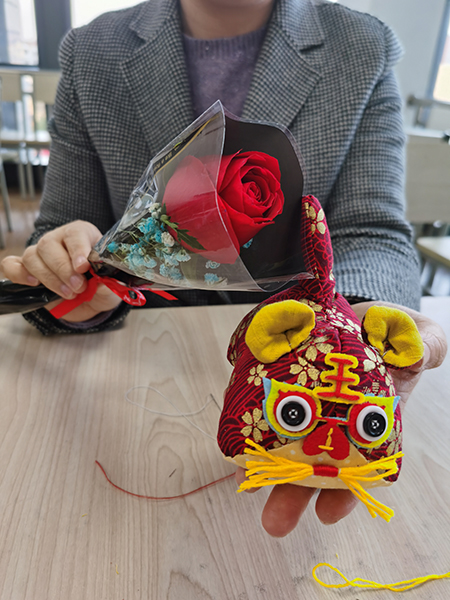 当然,女神节怎能缺少鲜花?一朵朵娇艳的玫瑰花映衬着女神们格外美丽动人。大家手捧着自己亲手缝制的布老虎,对着生活比个耶,接下来的日子定能虎虎生威!