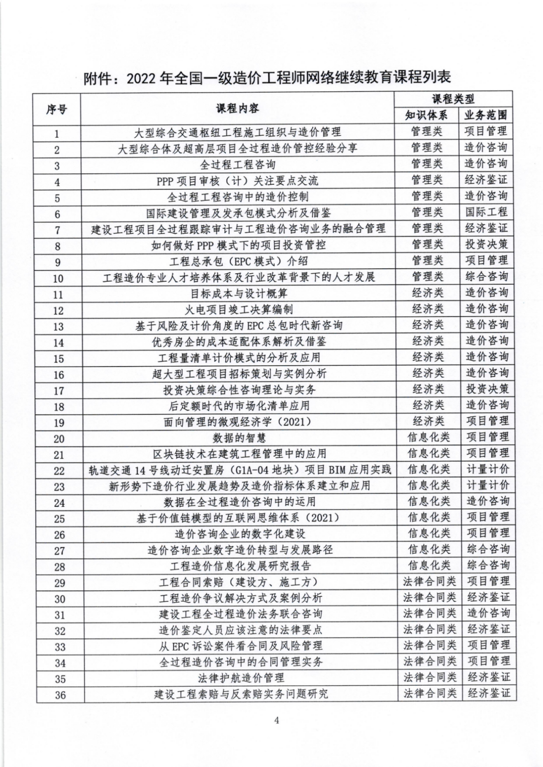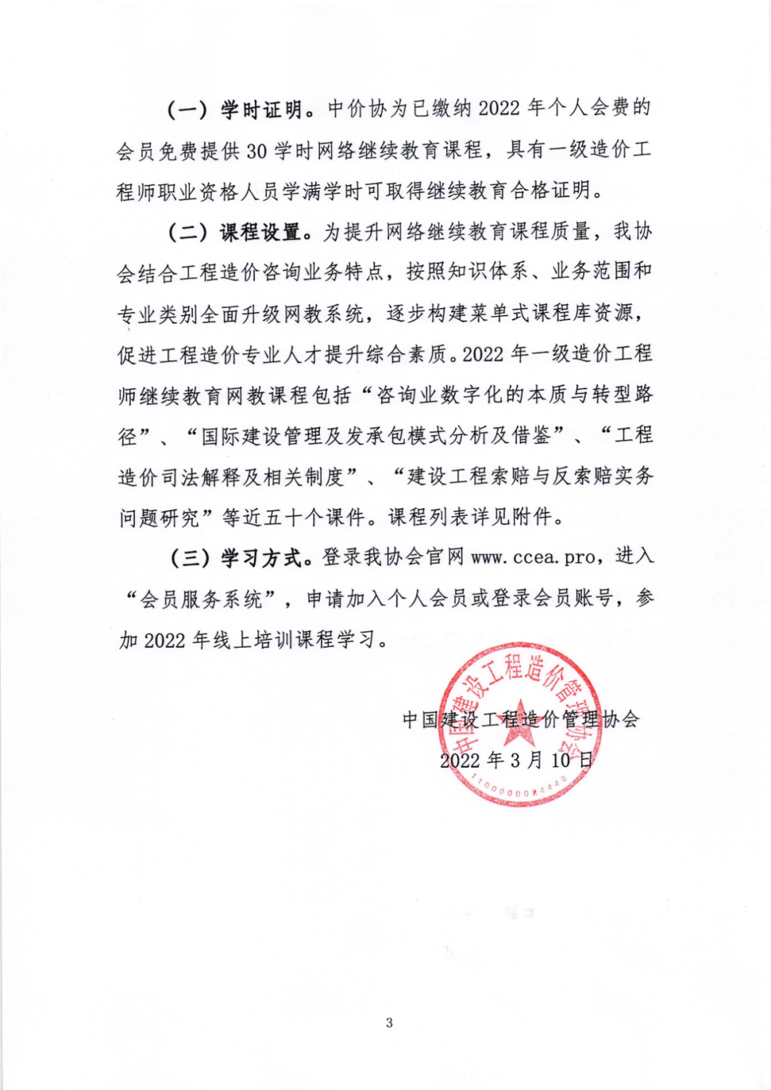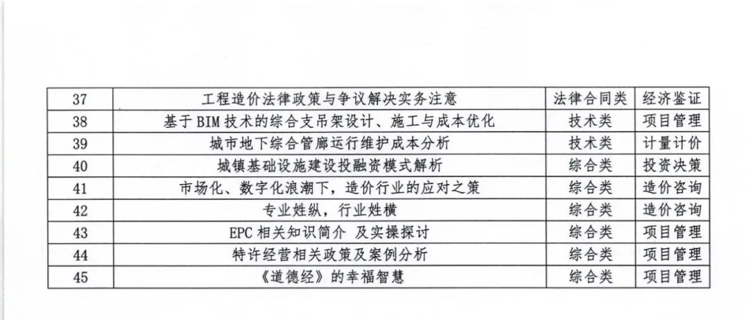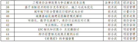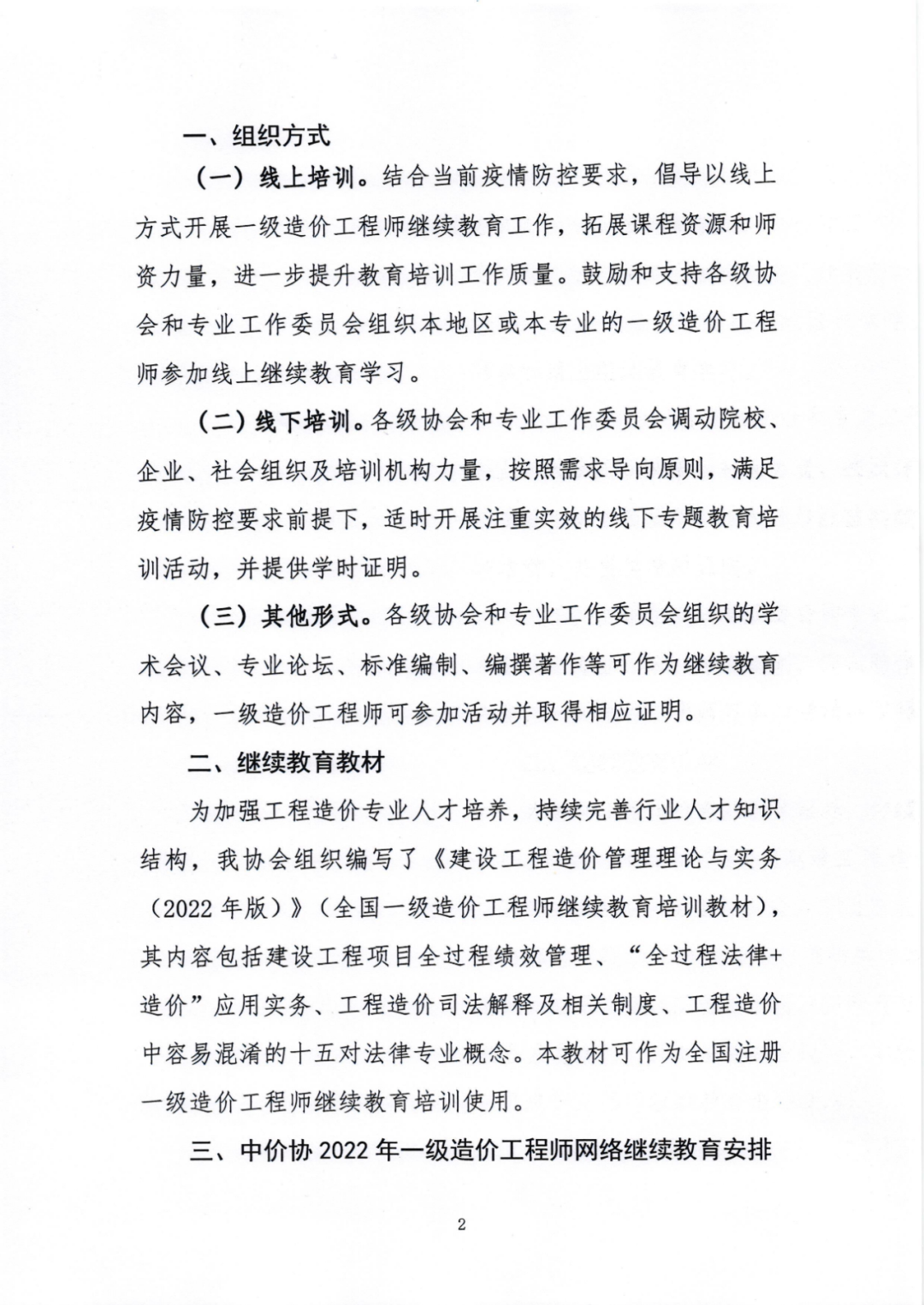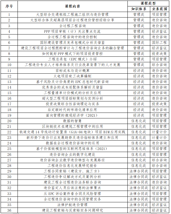 (二)线下培训。各级协会和专业工作委员会调动院校、企业、社会组织及培训机构力量,按照需求导向原则,满足疫情防控要求前提下,适时开展注重实效的线下专题教育培训活动,并提供学时证明。 (三)其他形式。各级协会和专业工作委员会组织的学术会议、专业论坛、标准编制、编撰著作等可作为继续教育内容,一级造价工程师可参加活动并取得相应证明。 为加强工程造价专业人才培养,持续完善行业人才知识结构,中价协组织编写了《建设工程造价管理理论与实务(2022年版)》(全国一级造价工程师继续教育培训教材),其内容包括建设工程项目全过程绩效管理、“全过程法律+造价”应用实务、工程造价司法解释及相关制度、工程造价中容易混淆的十五对法律专业概念。本教材可作为全国注册一级造价工程师继续教育培训使用。 (一)学时证明。中价协为已缴纳2022年个人会费的会员免费提供30学时网络继续教育课程,具有一级造价工程师职业资格人员学满学时可取得继续教育合格证明。 (二)课程设置。为提升网络继续教育课程质量,中价协结合工程造价咨询业务特点,按照知识体系、业务范围和专业类别全面升级网教系统,逐步构建菜单式课程库资源,促进工程造价专业人才提升综合素质。2022年一级造价工程师继续教育网教课程包括“咨询业数字化的本质与转型路径”、“国际建设管理及发承包模式分析及借鉴”、“工程造价司法解释及相关制度”、“建设工程索赔与反索赔实务问题研究”等近五十个课件。课程列表详见附件。 (三)学习方式。登录中价协官网www.ccea.pro,进入“会员服务系统”,申请加入个人会员或登录会员账号,参加2022年线上培训课程学习。