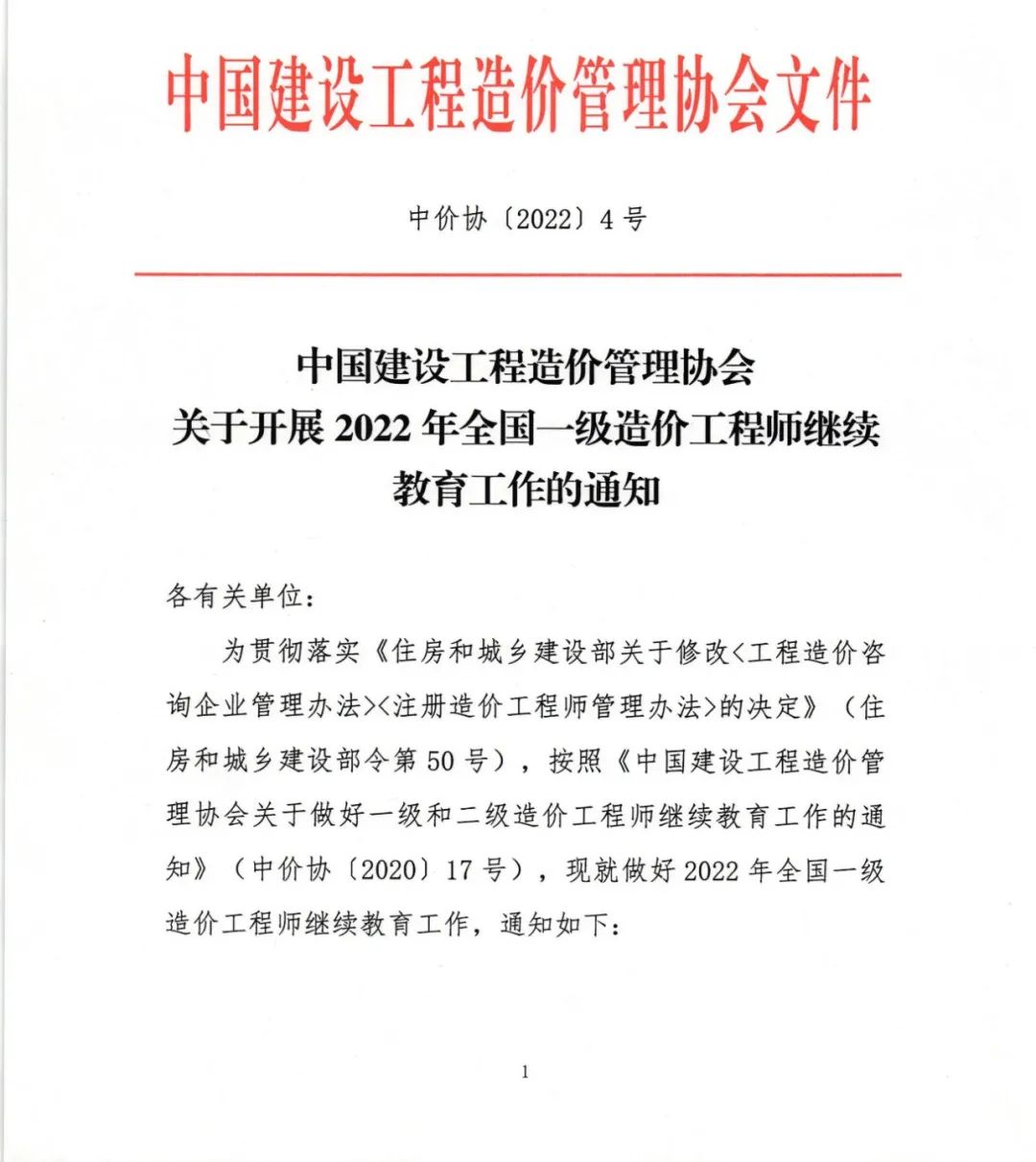为贯彻落实《住房和城乡建设部关于修改<工程造价咨询企业管理办法><注册造价工程师管理办法>的决定》(住房和城乡建设部令第50号),按照《中国建设工程造价管理协会关于做好一级和二级造价工程师继续教育工作的通知》(中价协〔2020〕17号),现就做好2022年全国一级造价工程师继续教育工作,通知如下。