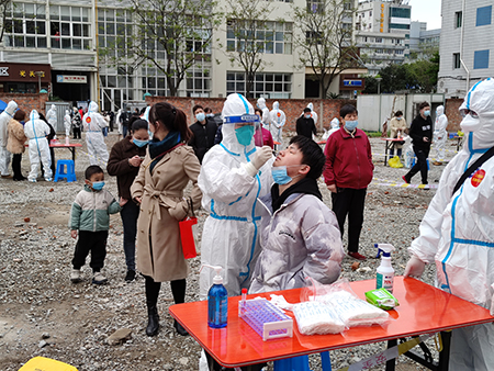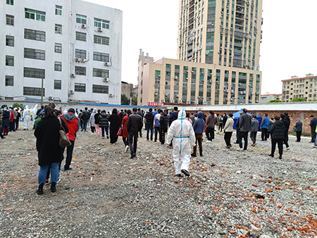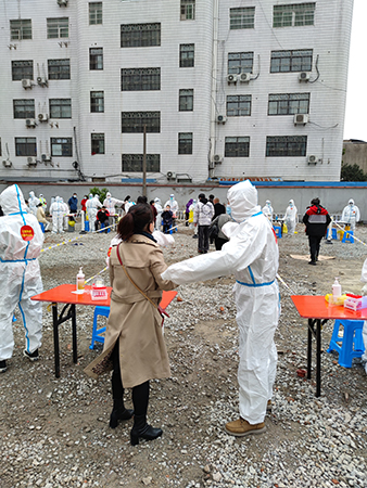 在核酸检测点,志愿者们站在不同的工作点位,忙碌的身影不时出现在人群中。“请大家排好队,保持一米间距,提前准备好支付宝的健康码或者身份证”。他们一遍遍不厌其烦地提醒着赶来做核酸检测的居民们,协助维持现场秩序。