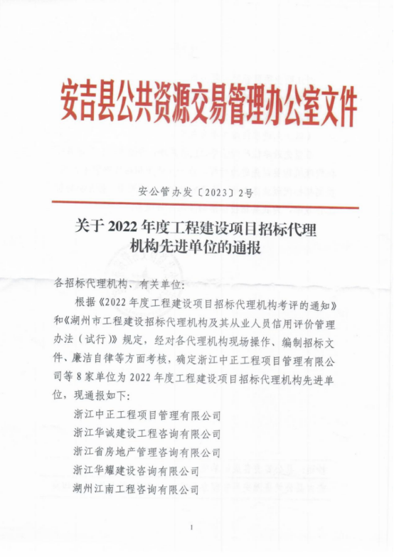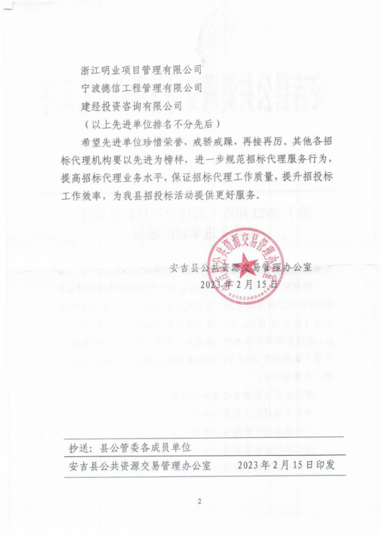 恭喜宁波德信工程管理有限公司安吉分公司获得安吉县公共资源交易管理办公室“2022年度工程建设项目招标代理机构先进单位”称号!祝愿安吉分公司蓬勃发展,再创佳绩!