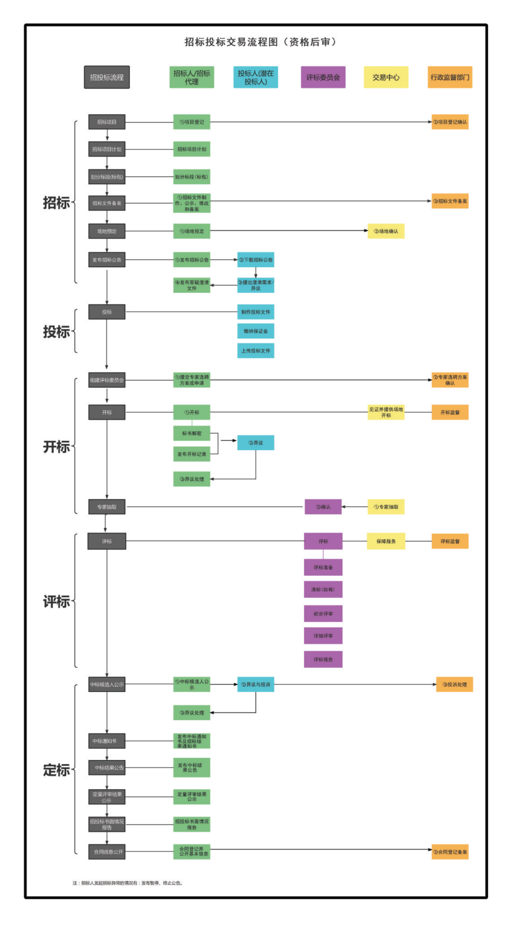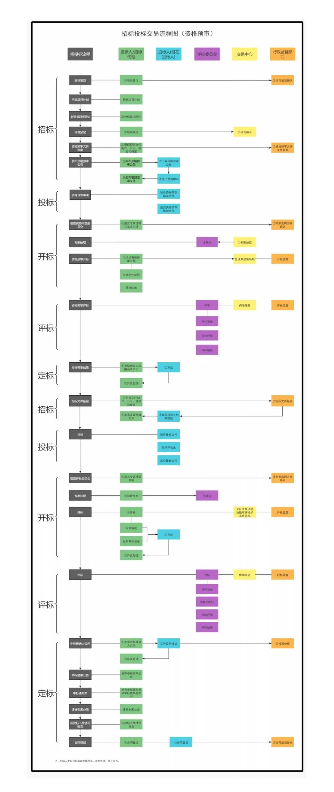 1.范围 本标准规定了数字招标交易系统(以下简称“交易系统”)招标、投标、开标、评标、定标的标准流程,适用于浙江省工程建设项目数字招标投标活动。 2.规范性引用文件 下列文件对于本文件的应用是必不可少的。凡是注日期的引用文件,仅注日期的版本适用于本文件。凡是不注日期的引用文件,其最新版本(包括所有的修改单)适用于本文件。 《中华人民共和国招标投标法》及《中华人民共和国招标投标法实施条例》 《浙江省招标投标条例》 《电子招标投标办法》(国家发展改革委第20号令) 《电子招标投标系统技术规范》 《公共资源交易平台管理暂行办法》(国家发展改革委第39号令) 《浙江省人民政府关于进一步加强工程建设项目招标投标领域依法治理的意见》(浙政发〔2021〕5号) 3.术语和定义 《中华人民共和国招标投标法》《中华人民共和国招标投标法实施条例》《电子招标投标办法》界定的术语和定义适用于本文件。 4.招投标流程 4.1 招标 4.1.1 项目建立 招标项目的建立由招标人执行操作。招标人原则上通过录入浙江省投资项目在线审批监管平台中的项目代码获取项目基础信息,按照交易系统要求,补充录入其它必要信息,建立招标项目。 不通过浙江省投资项目在线审批监管平台申报审批的项目,招标人直接录入项目信息,建立招标项目。 招标人委托招标代理的,应在交易系统中明确招标代理的代理权限。招标代理应在招标人委托的范围内办理相关事项。 4.1.2 招标计划 招标人需根据招标项目情况合理安排招标活动,在交易系统中完善项目招标计划、进展等信息。 4.1.3 划分标段包 招标人需根据项目情况合理划分项目标段(包),在交易系统中完善各标段(包)信息。 4.1.4 招标文件/资格预审文件备案 招标人需使用文件编制工具完成招标文件或资格预审文件的编制及签章。 依法必须招标项目公开招标的,招标人应将招标文件或资格预审文件在交易系统和省公共资源交易服务平台进行公示,公示期不少于3日,潜在投标人和社会公众可进行浏览下载,并在线提出意见建议。招标人应在交易系统中查看意见建议并进行评估,结合招标项目情况完善招标文件或资格预审文件,签章后提交招标投标行政监督部门备案。 4.1.5 场地预定 项目开标评标时间确定后,招标人应及时通过交易系统预约场地,由交易中心进行确认。 4.1.6 发布招标公告/资格预审公告 公开招标项目采用资格后审的应发布招标公告,采用资格预审的应发布资格预审公告。招标人应在交易系统和省公共资源交易服务平台发布招标公告和资格预审公告。 邀请招标项目由招标人向被邀请单位发送投标邀请书,被邀请单位可选择是否接受邀请。 潜在投标人可对招标文件或资格预审文件内容提出澄清需求,招标人通过交易系统将答疑、澄清内容提交招标投标行政监督部门备案后发布。 4.2 投标 4.2.1 投标文件/资格预审申请文件编制 投标人使用投标文件制作工具制作投标文件或资格预审申请文件,并进行签章加密。 4.2.2 上传投标文件/资格预审申请文件 投标人或资格预审申请人须在投标文件或者资格预审申请文件递交截止时间之前将制作完成的文件上传至交易系统。 4.2.3 缴纳投标保证金 投标人须在招标文件约定的截止时间前完成投标保证金缴纳。 4.3 开标 4.3.1 组建评标委员会/资格审查委员会 招标人根据标段情况录入回避情形、专家专业和人数等抽取条件,形成专家选聘方案,并在交易系统中申报,由招标投标行政监督部门确认。 4.3.2 开标 开标全过程采用不见面开标。 交易中心提供开标场地,由招标人主持项目开标,公布投标人、解密投标文件、公布开标结果并即时在交易系统和省公共资源交易服务平台发布开标记录。 4.3.3 专家抽取 招标人根据专家选聘方案在交易中心的省综合性评标专家库抽取终端随机抽取专家。 4.4 评标 4.4.1 评标准备 评标委员会成员应进入指定评标位评标。登录评标系统后,评标委员会成员应确认是否存在回避情形,推举评标组长,掌握评审要求。 4.4.2 清标 清标是评标系统对投标文件或资格预审申请文件进行计算、比对、检查。评标委员会可通过系统查看比对找出存在的问题,形成清标结果。 4.4.3 评审 评标委员会根据评标办法中规定的评审因素和评审标准,对投标文件资信、技术、商务等部分进行评审。 4.4.4 评标结果 评标完成后,评标委员会形成书面评标报告,按招标文件规定推荐合格的中标候选人,形成中标候选人公示表。评标报告应由评标委员会全体成员进行电子签章。 4.5 定标 4.5.1 中标候选人公示/资格预审结果公示 招标人应在交易系统中确认中标候选人公示表并在交易系统或省公共资源交易服务平台公示,公示期不少于3日。 采用资格预审的项目,招标人应在交易系统或省公共资源交易服务平台发布资格预审结果公示,公布未通过资格预审的申请人名单及未通过的原因,公示期不少于3日。 4.5.2 中标通知书/招标结果通知书/中标结果公告 招标投标交易流程图